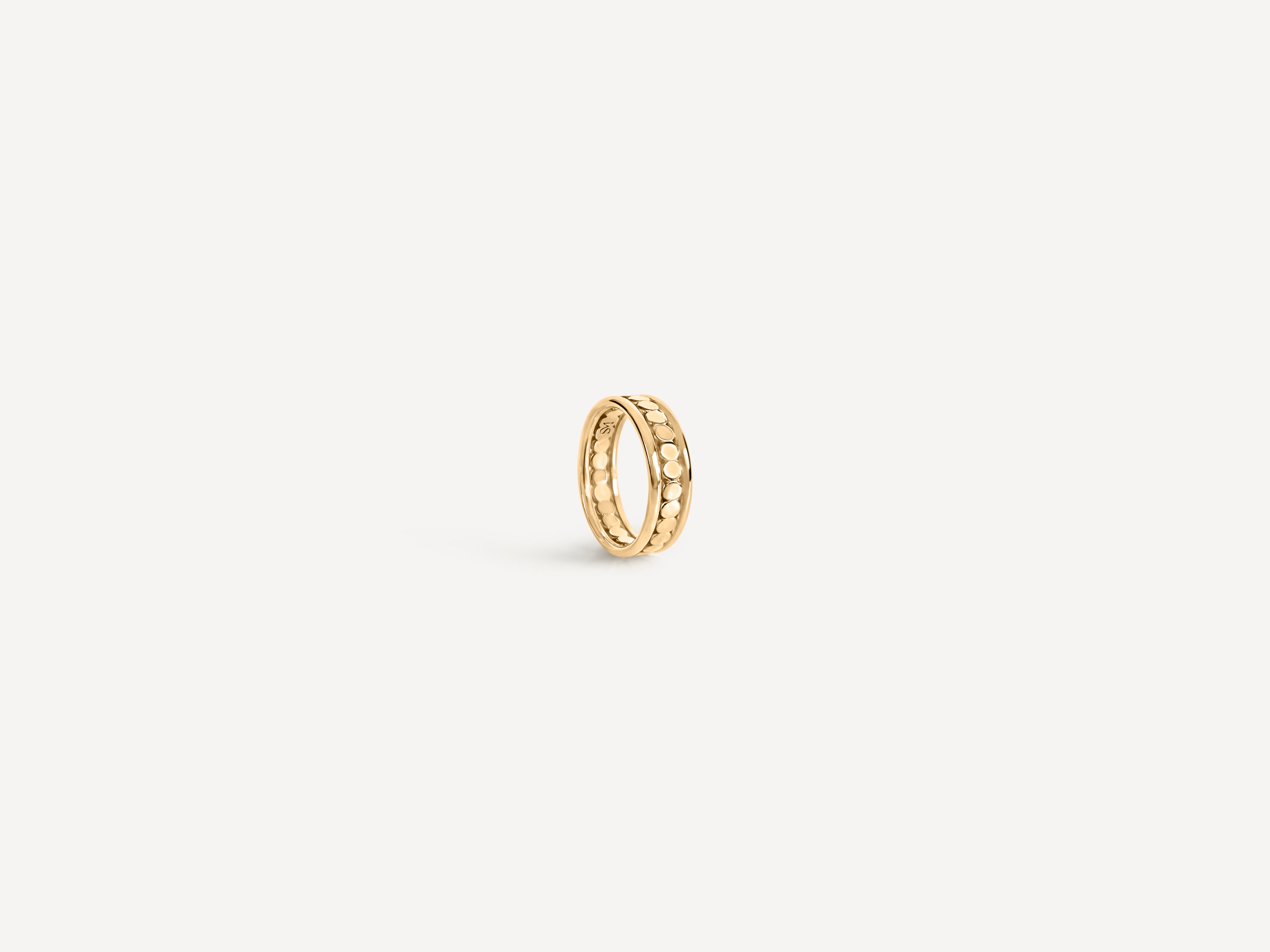 With its rhythmic dotted pattern framed by clean edges, the Celeste Band offers a balance of structure and softness. The repeating details catch the light in quiet intervals, creating subtle texture that feels both modern and timeless. Thoughtfully designed to stand alone or pair with other bands, it brings a sculptural element to your everyday styling.