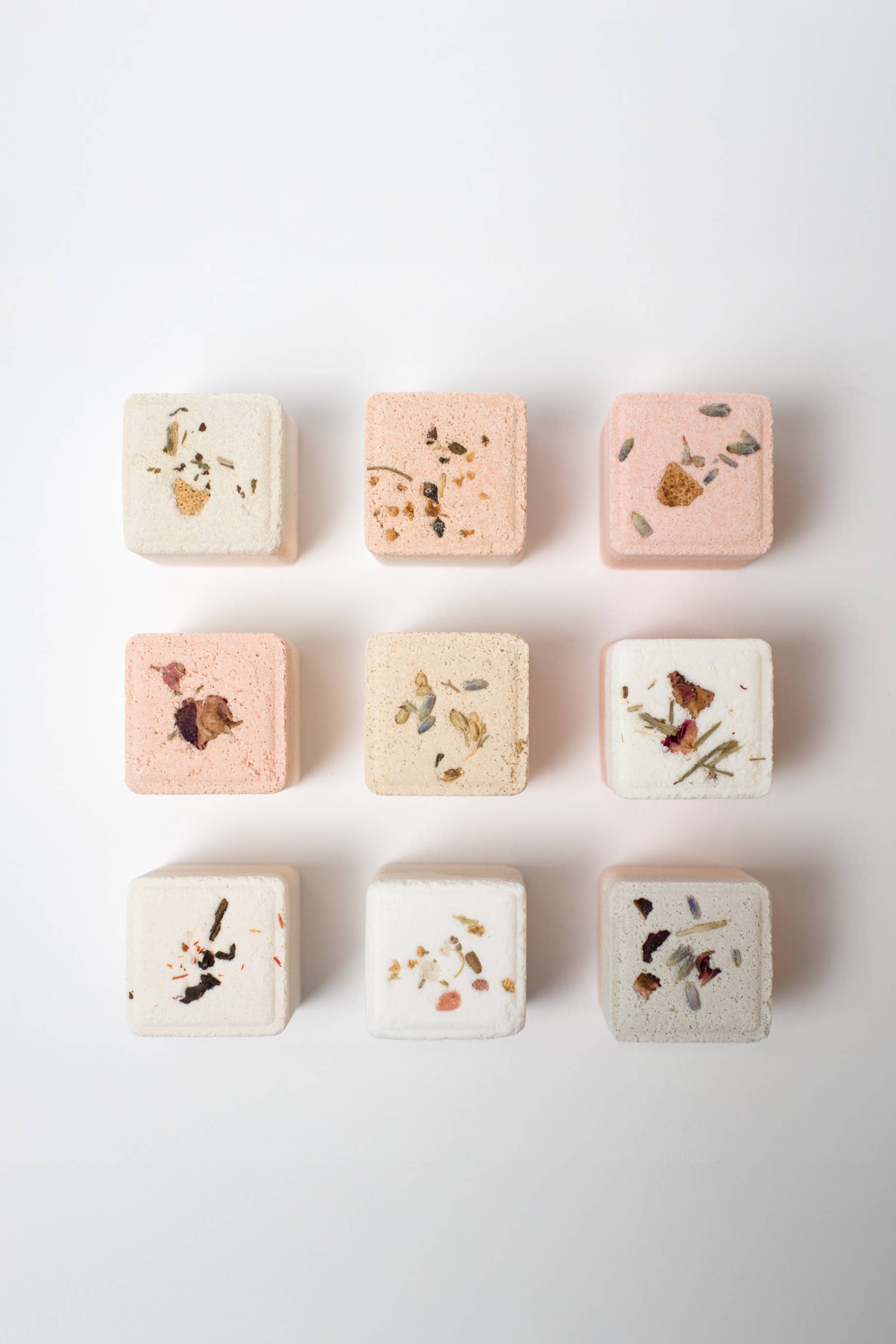 Each fizzy cube is handcrafted using pure clays for color and essential oils for scent — no fillers, no artificial dyes. Infused with shea butter, they soften and nourish as they dissolve. Use one in a bath or set it in your shower to release waves of scent and steam that ease tension from the skin outward. *