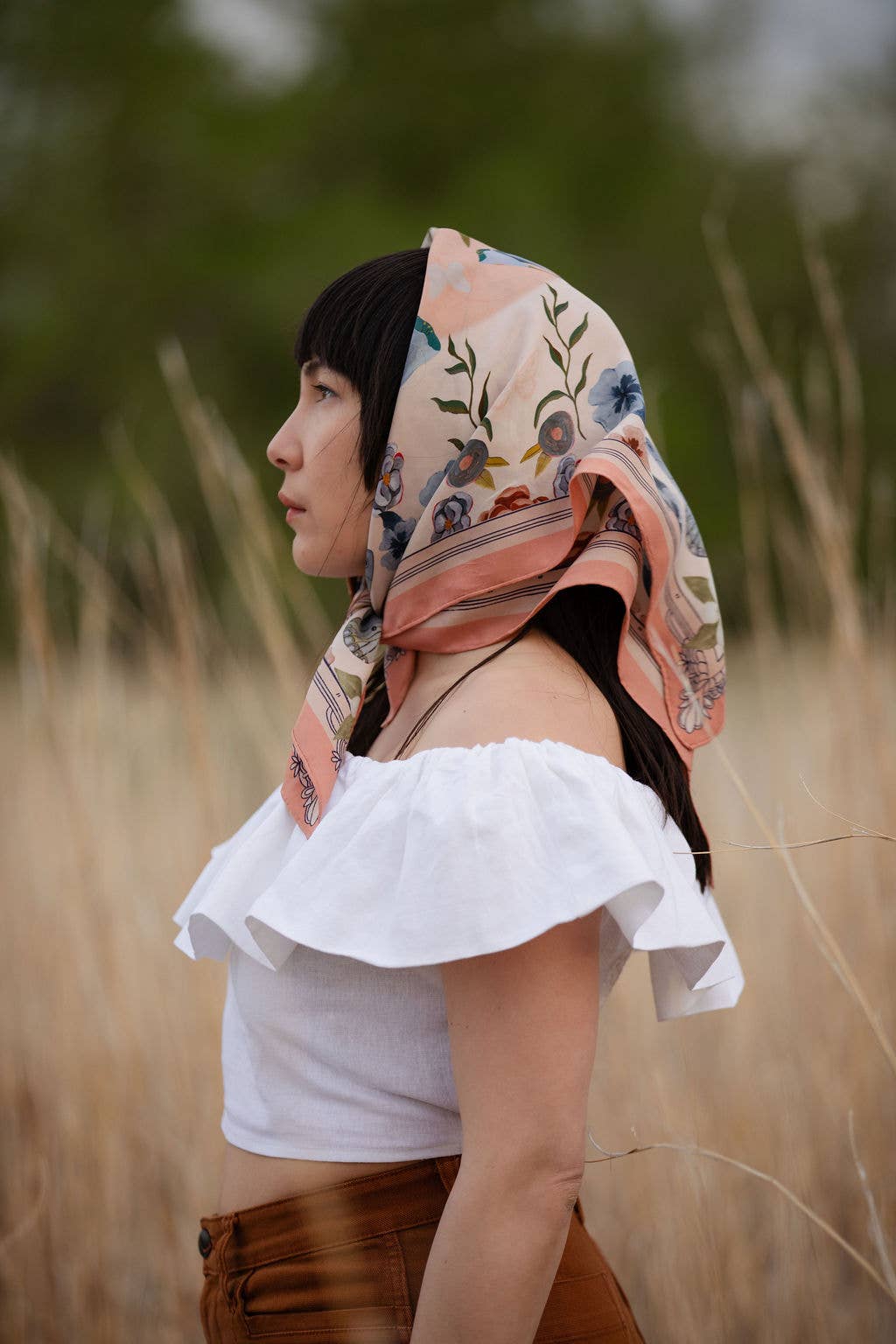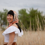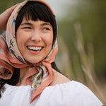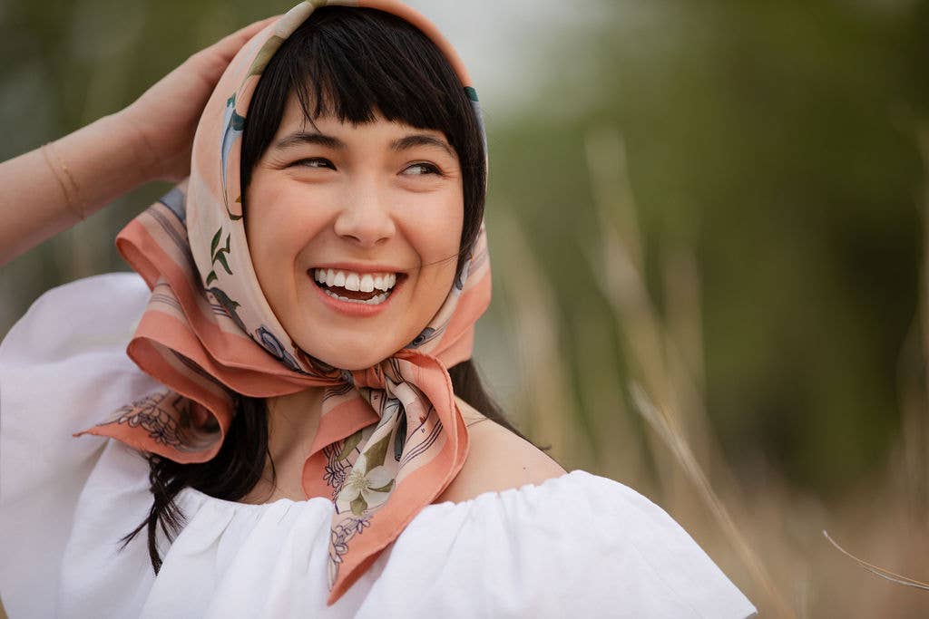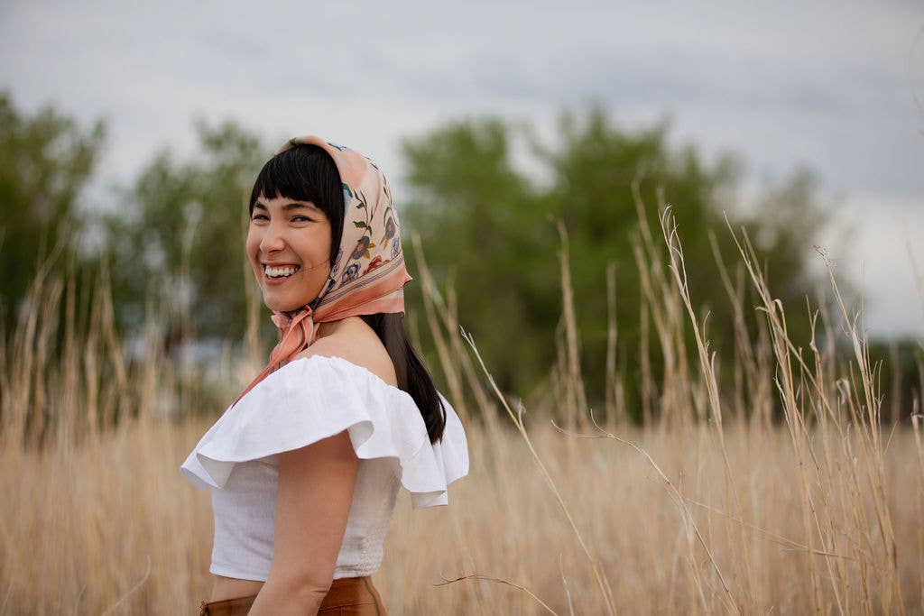 Designed by local Colorado artist Matty Miller, this silk scarf pays tribute to the state flower, the Columbine. A tapestry of blossoms and butterflies unfolds in soft blush, icy blue, and muted olive tones, reflecting the quiet strength of this alpine bloom that thrives in high altitudes.