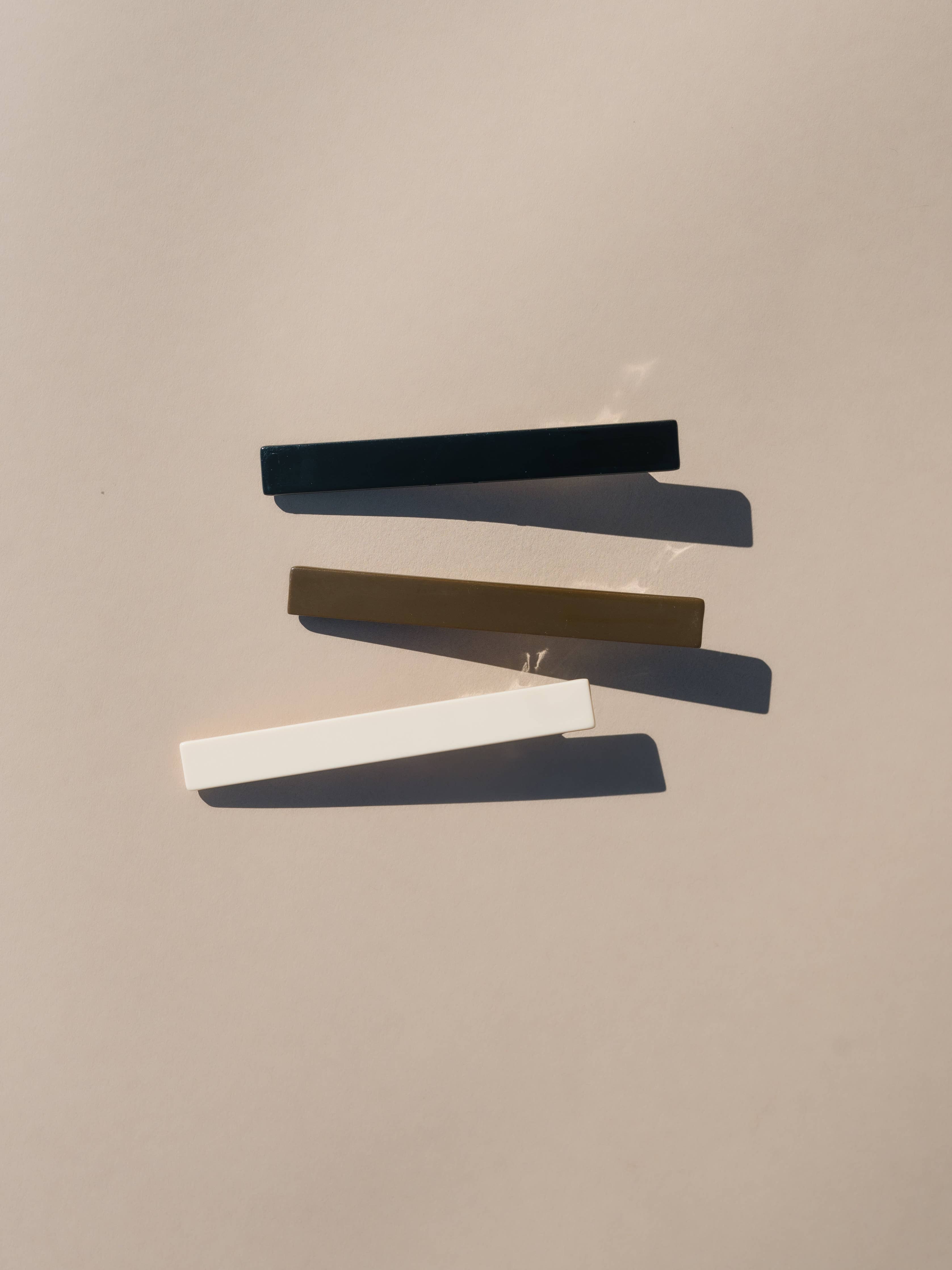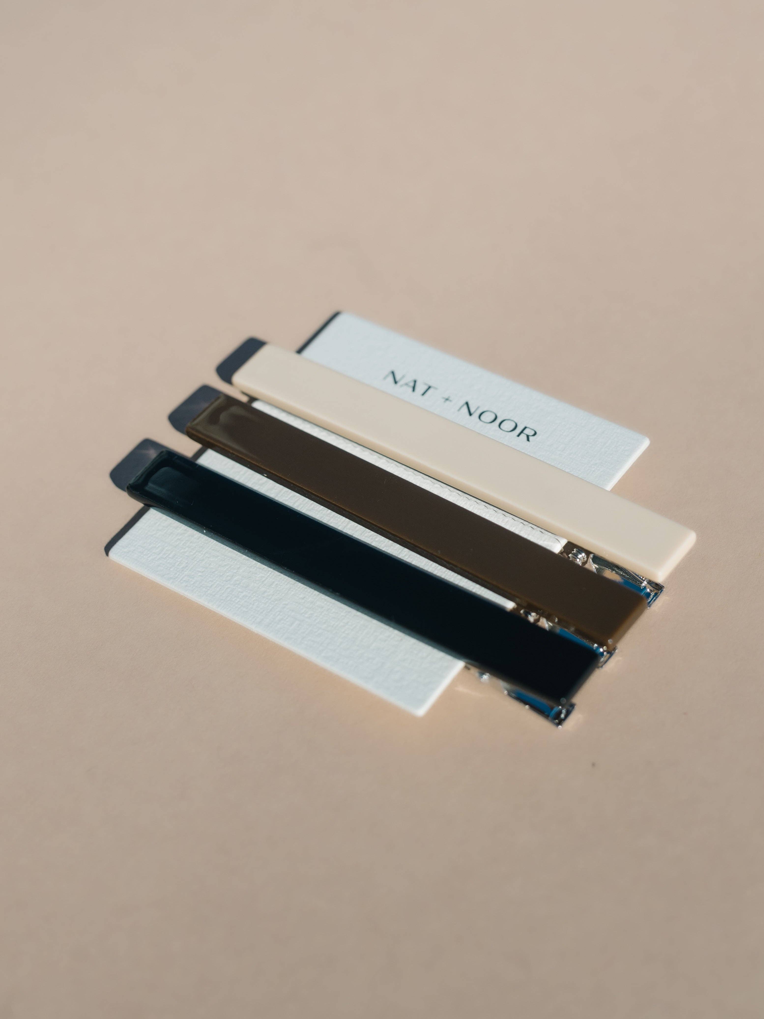 A minimal staple for effortless styling. The Evie Clips in neutral tones—black, brown, and cream—pair cellulose acetate tops with strong metal alligator-style hardware for a firm, secure grip. Designed to stay put, these clips work well for both thick and thin hair, and every texture in between.