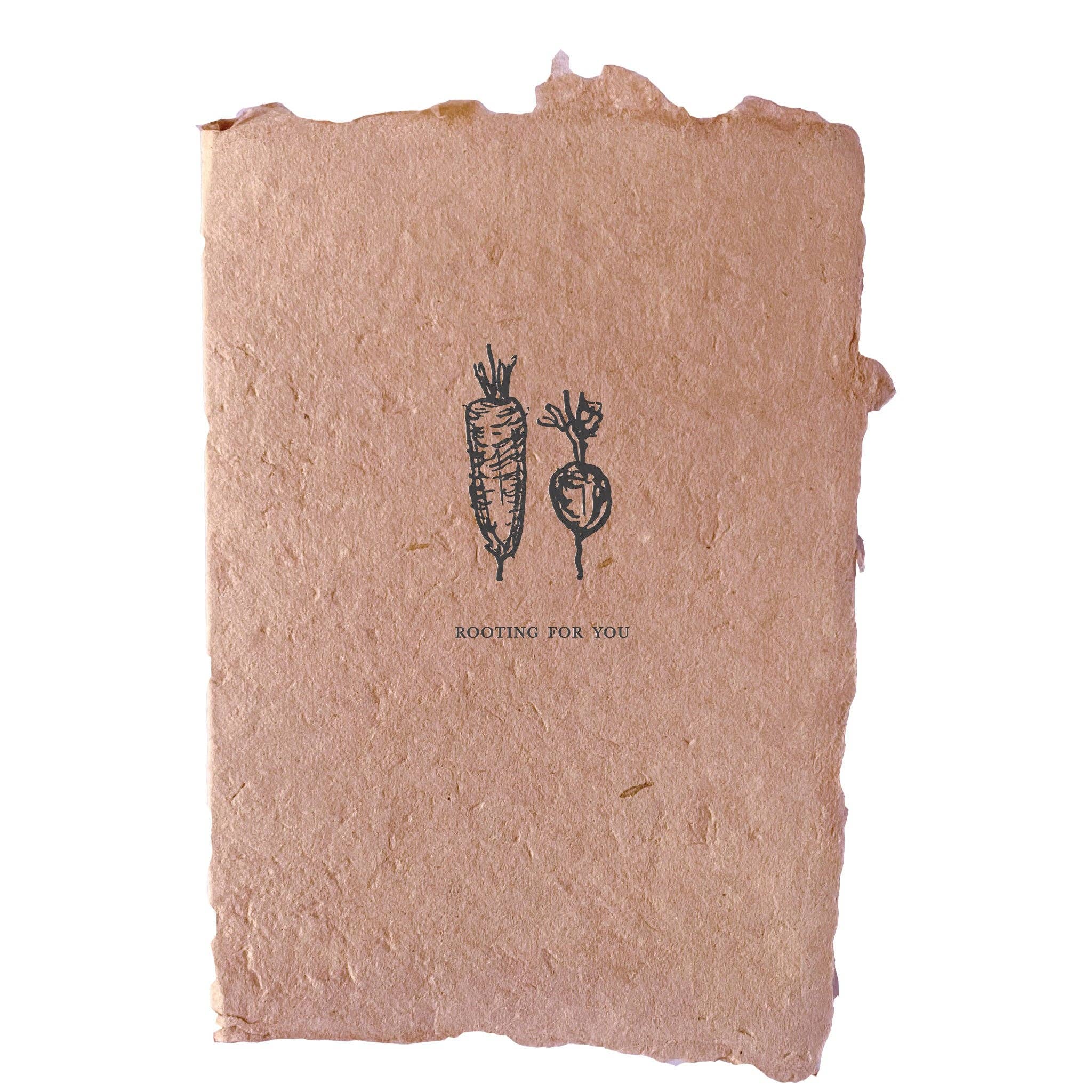 This folded card features a trio of root vegetables and the phrase “rooting for you,” letterpress printed in black ink on terra cotta handmade paper with four full deckled edges.