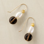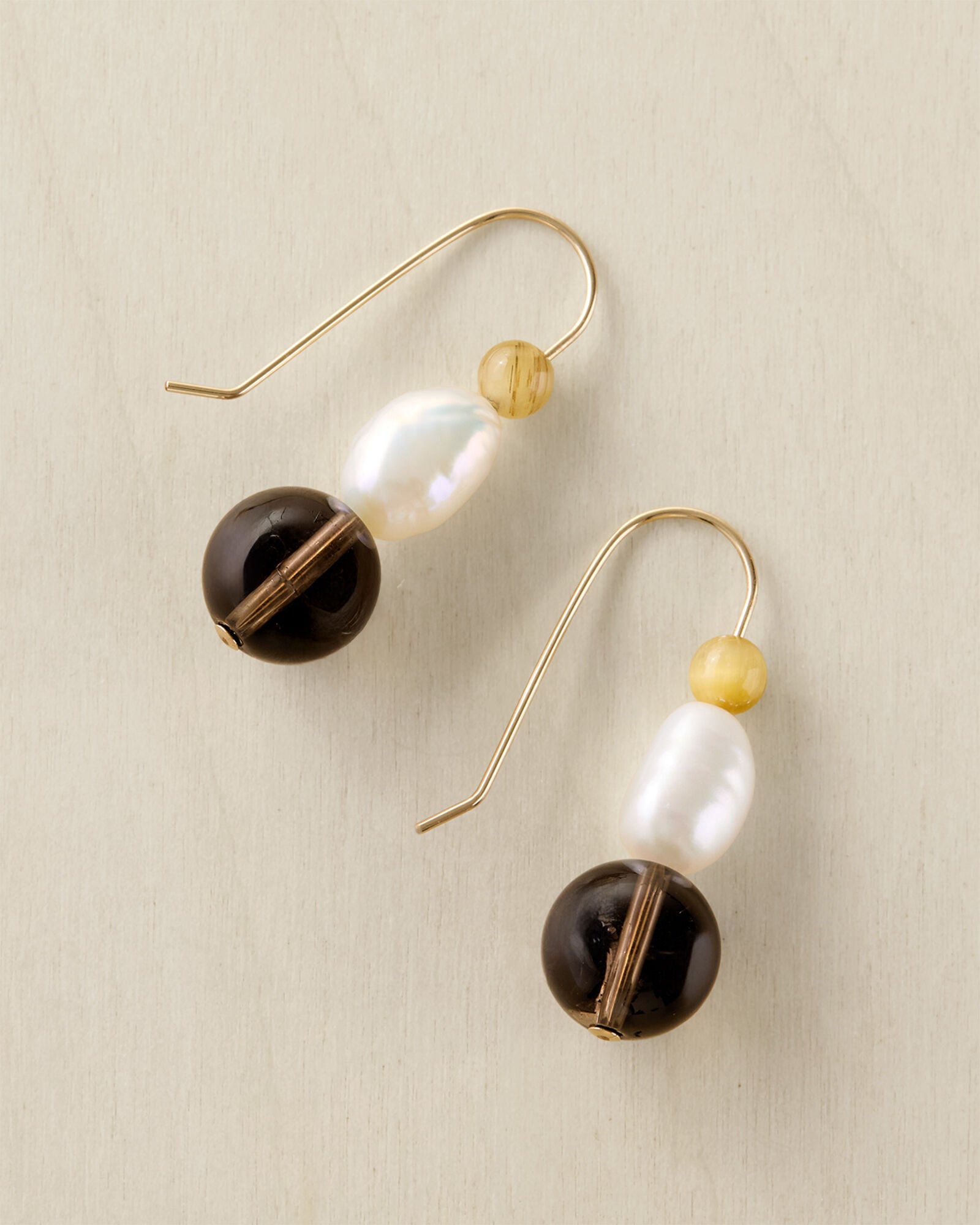 Layered and intentional, the Slate & Pearl Earrings bring together earthy depth and soft luminosity. A trio of thoughtfully chosen elements—smoky quartz, freshwater baroque pearl, and golden tiger’s eye—suspend from 14k gold-filled ear wires in a clean vertical line. The result is a quiet contrast of tone and texture that feels both grounded and elevated.