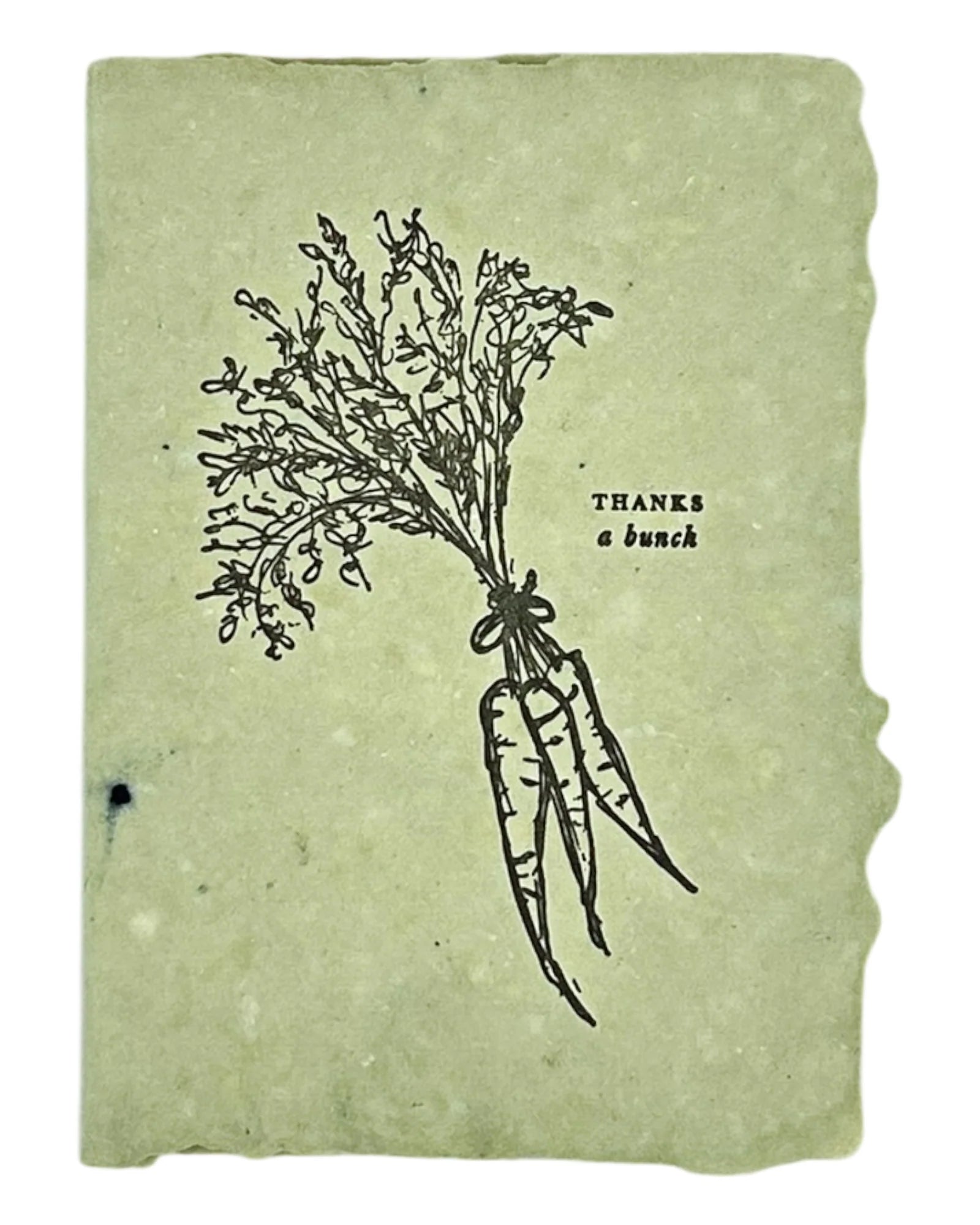 When you want to show your thanks, this charming card with carrot illustration is sure to make them smile.Leaf handmade paper with black letterpress ink.