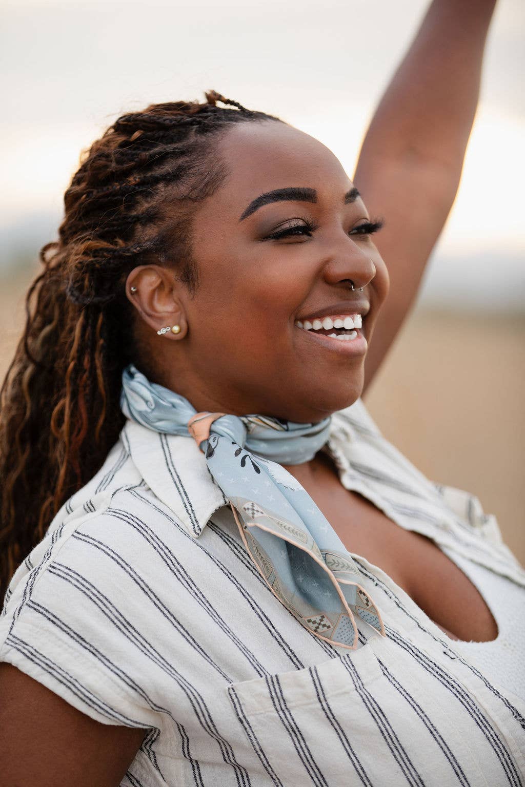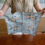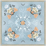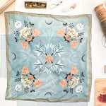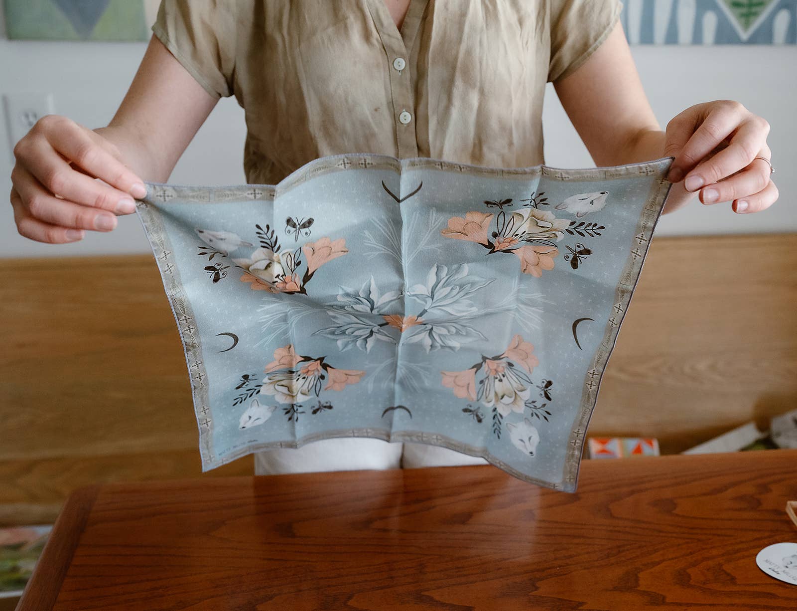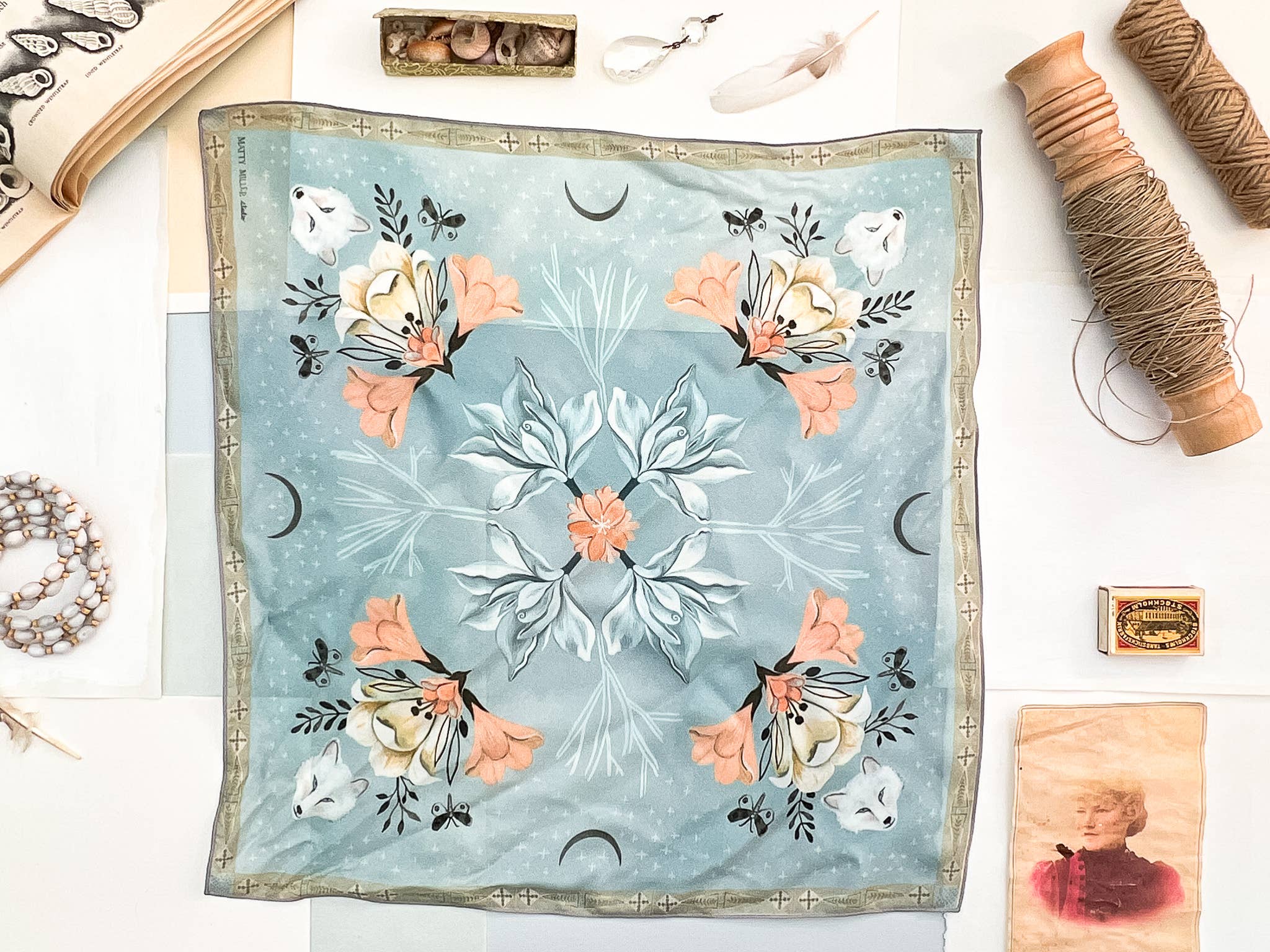 Local Colorado artist Matty Miller brings together an arctic fox, slivers of moonlight, and delicate florals in icy blue and warm peach. Hand-painted details create a timeless design meant to be worn in every season.