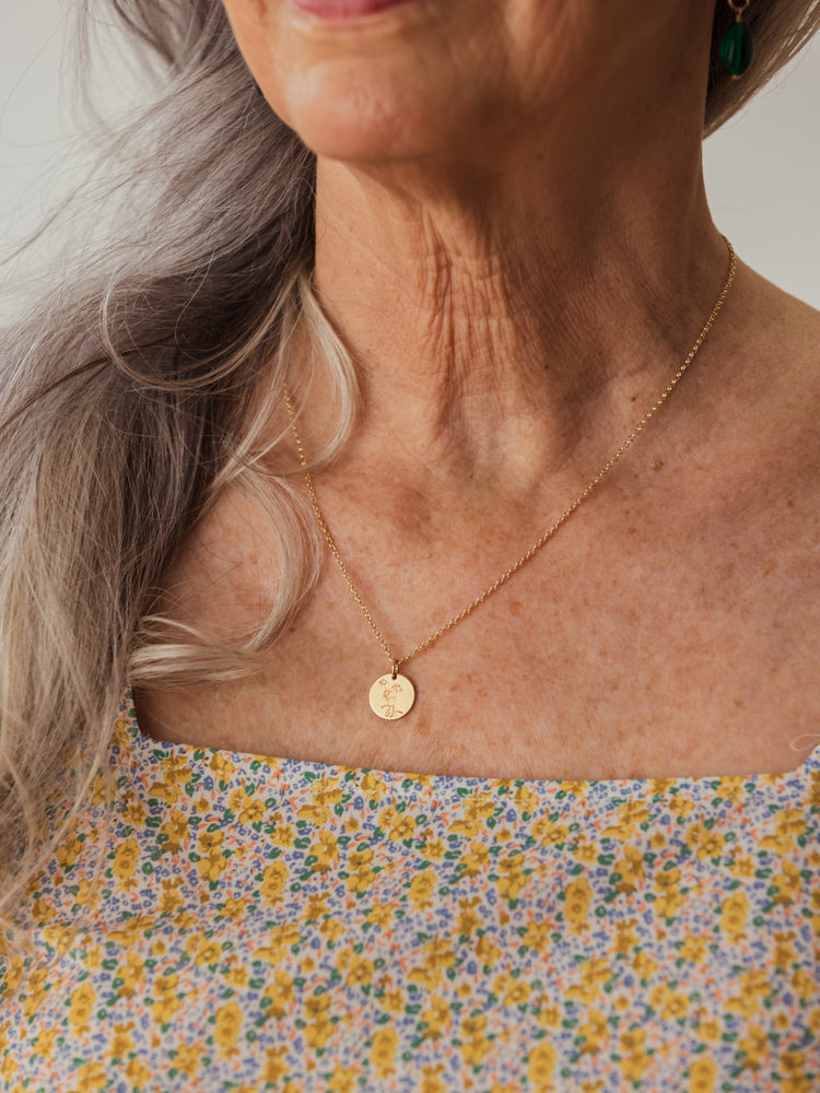 Crafted in collaboration with local Denver artist Sheena Marshall and oil painter Whitner Carlin, this necklace captures the delicate beauty of wild daisies. The pendant features Whitner's original hand-drawn daisy design, transformed into a 12mm metal stamp, creating a piece that feels both artful and effortless.