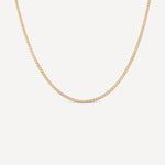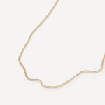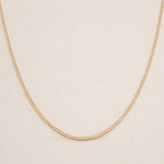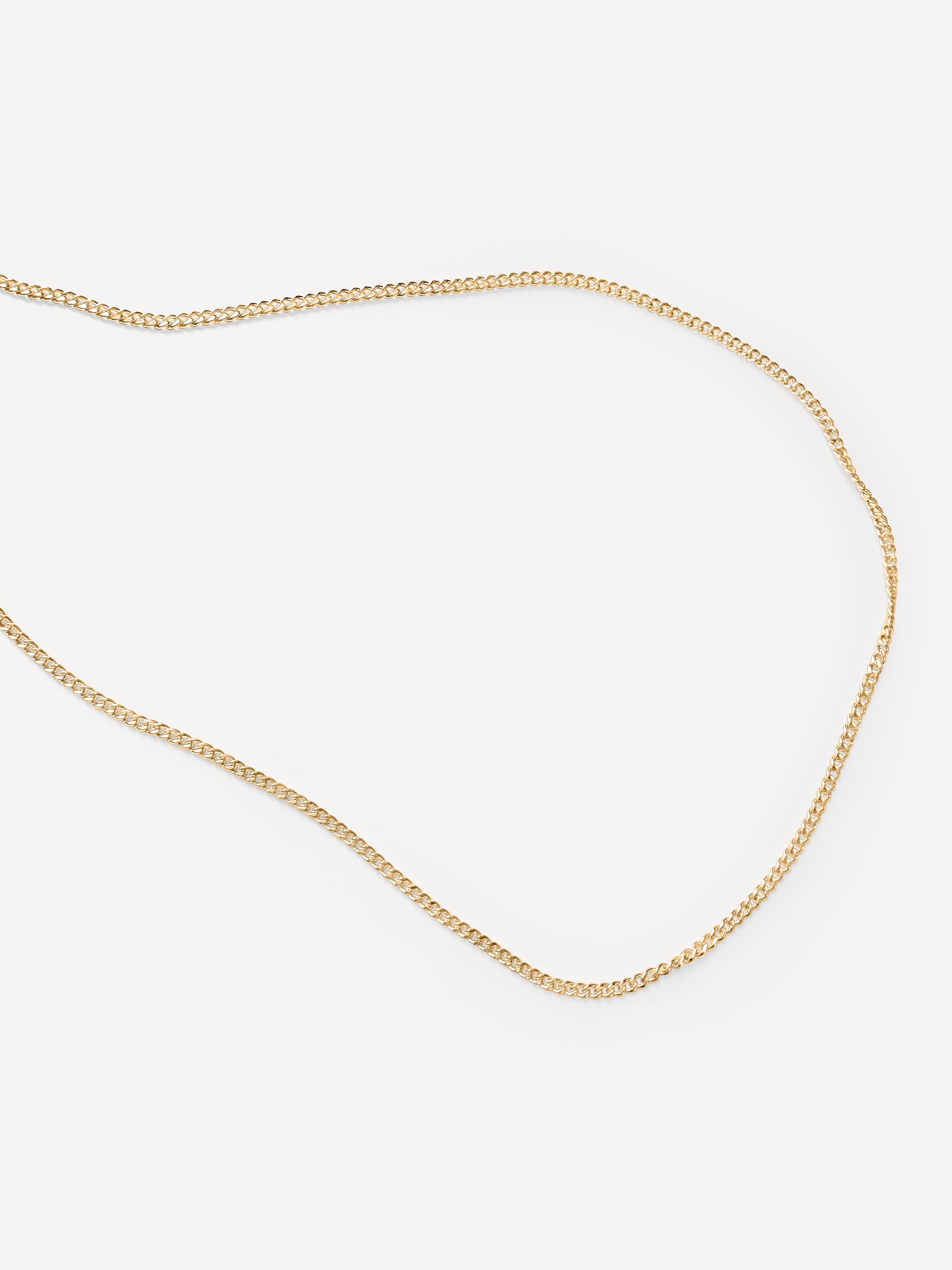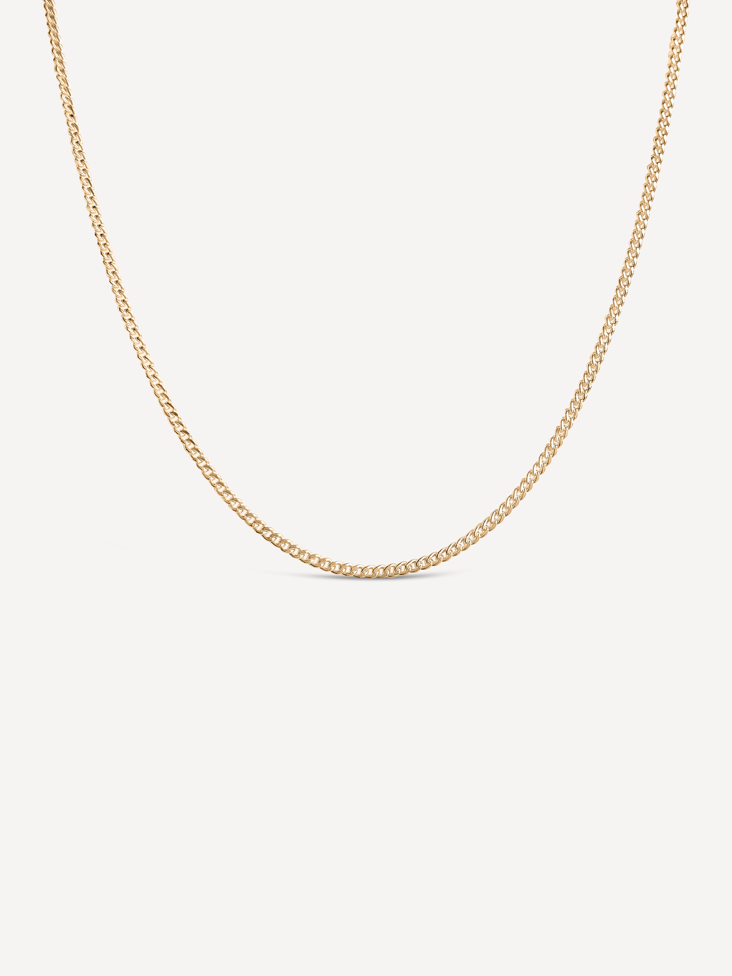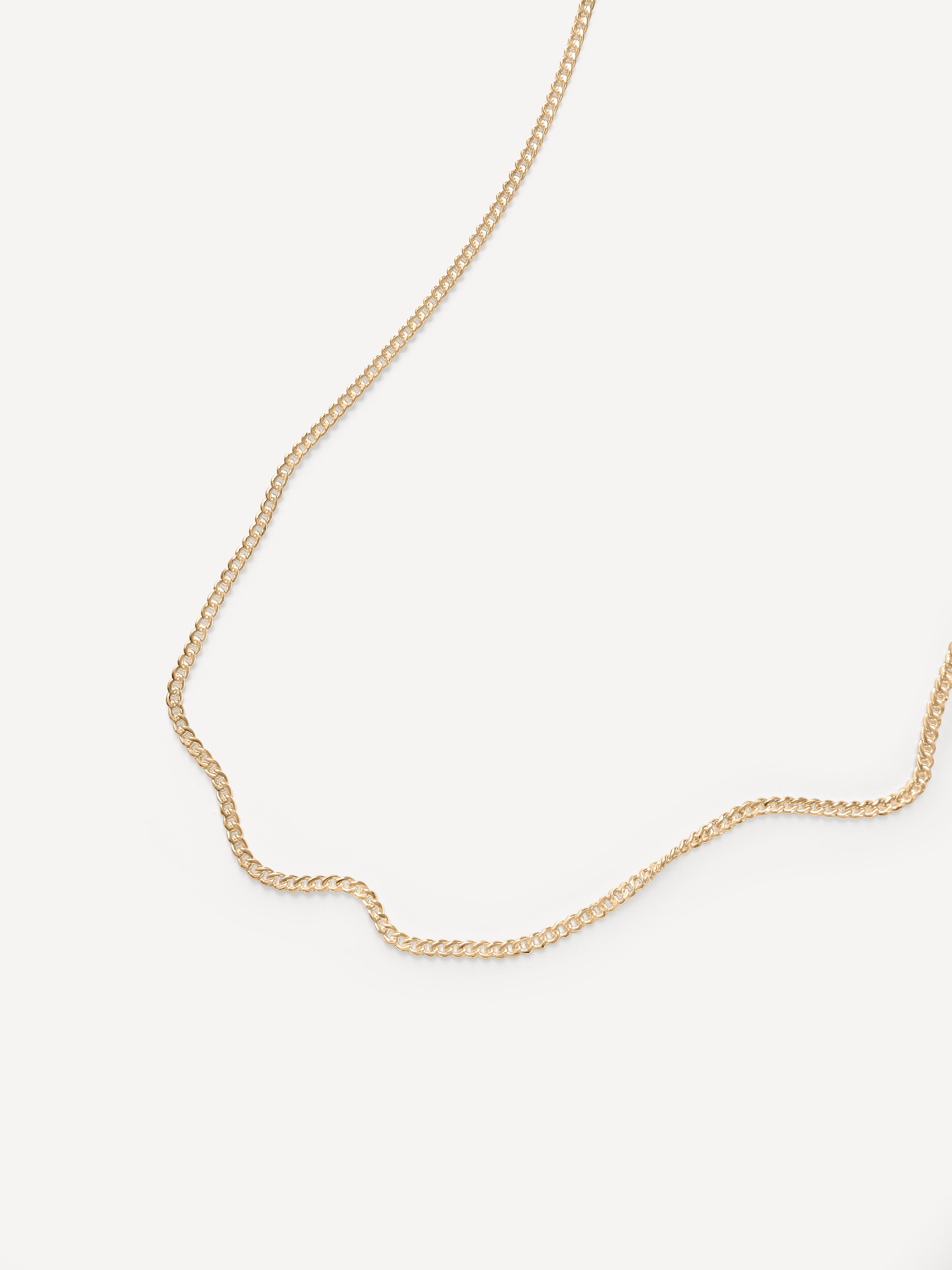 A timeless staple designed for effortless styling. The Wren Curb Chain features a delicate, close-linked design that catches the light with subtle movement. Its clean lines and refined profile make it perfect worn solo for understated polish or layered with your favorite pendants and chains.